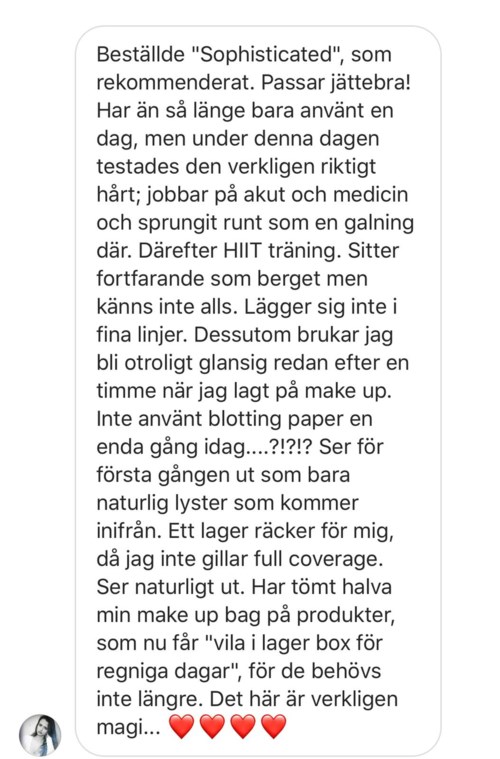 - Inlägget skapades 6 år"Jobbar på akut och medicin och sprungit runt som en galning där. Därefter HIIT träning. Sitter fortfarande som berget men känns inte alls. Lägger sin inte i fina linjer. Dessutom brukar jag bli otroligt glansig redan efter en timme när jag lagt på make up. INte använt blotting paper en enda gång idag....?!?!?!?! Ser för första gången ut som bara naturlig lyster som kommer inifrån..." Här kommer en helt otrolig recension av The Base foundation i nyansen Sophisticated, skickad till vår Instagram ❤️❤️❤️1 produkt i inlägget3870 visningar