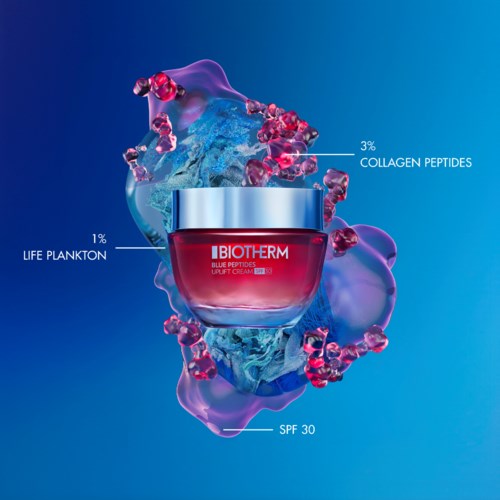 Biotherm Blue Peptides Uplift ansiktskräm är berikad med Biotherms signaturingrediens Life Plankton som har en unik förmåga att främja hudens återbildande och stärka andra ingrediensers verkan. Där utöver innehåller krämen kollagen peptid-fraktioner som bidrar till att kompensera för synliga ålderstecken orsakade av kollagenförlust i huden. Blue Peptides Uplift Cream SPF30 är en fuktgivande och uppstramande dagcreme för alla hudtyper som även är lämplig för känslig hud. Denna kräm innehåller också ett högt SPF-skydd, vilket skyddar din hud mot ålderstecken från solens UV-strålar. Ansiktskrämen ger en behaglig sensorisk upplevelse vid applicering och en omedelbar rosig lyster. Använd krämen varje morgon efter rengöring av ansiktet och halsen. INGREDIENSER: LIFE PLANKTON: Biotherms ikoniska aktiva och naturliga ingrediens, sex gånger patenterad, med unik förmåga att främja hudens regenerering och boosta effektiviteten av andra ingredienser. KOLLAGENPEPTIDFRAKTIONER: Bidrar till att kompensera för synliga ålderstecken orsakade av kollagenförlust i huden. SPF30: Skyddar din hud mot åldrande orsakat av UV-strålar. Blue Peptides Uplift-hudvårdsserien består av fyra ansiktskrämer målriktade mot olika behov och rutiner. Gemensamt för dem alla är att de har fuktgivande och uppstramande egenskaper, som bidrar till att bevara en fast och synligt uppstramad hud. Oavsett om du letar efter en rik nattkräm, en lätt nattkräm eller en ansiktskräm som förenar UV-skydd med peptider, finns det en Blue Peptides Uplift ansiktskräm för dig.5 produkter i looken UPPLEV BIOTHERMS NYA ANSIKTSKRÄM MED PEPTIDERBiotherm