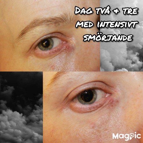 Jag fick denna produkt av bästa Ida här på Lyko efter att ha fått en ordentlig reaktion på en ögoncreme från Raunsborg som jag recenserade för ett tag sedan och som jag fick i uppdrag som lykoinflutester. Alltså tack snälla för att Ida & lyko skickade denna till mig. Den fick mina ögon att på mindre än 14 dagar gått tillbaka till sitt normala läge. Jag har i samband med reaktion fått sår och svullna ögon, irriterad och så tappade jag nästan alla mina fransar på båda ögonen 😭😭. Jag provade alla salvor jag hade här hemma men inget hjälpte tills denna underbara och magiska produkt kom till min ägo. Jag har givetvis stoppat all form av serum, tyngre ögonkrämer, ögonkrämer överlag, smink o sånt för att minska irritationen. Jag började redan samma dag att smörja mig med salvan. Behövs inte alls mycket och den är lite tunnare i konsistens än många andra vårdande salvor. Använde första dygnen minst 3-4 gånger istället för morgon & kväll bara. Bilderna visar hur det har förbättrats under 12 dagar. Dag 1-5 märktes ingen större skillnad och det var då jag smörjde som intensivast och från dag 6-8 så bildades blåsor som sedan la sig och det blev en torr hinna runt området , som även det la sig fort och efter dag 12 var mina ögon till det normala ❤️ Cremen är så lätt att massera/dutta in och återfuktar nåt gudomligt. Mådde så dåligt av reaktionen och gick inte utanför dörren på flera dagar för jag såg hemsk ut😭 Luktar ingenting, svider ingenting, jaa den gör bara under. Är så evigt tacksam för Lyko, Ida och hudterapeuterna som kunde tipsa om denna. Ni räddade mina ögon❤️❤️ Nu hoppas vi fransarna växer ut så snabbt som möjligt. Rekommenderar denna produkt varmt då den verkligen passar känsliga, irreterande samt utslag runt ögon. Tack🙏🙏❤️❤️