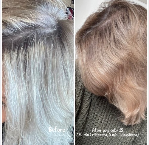Jag har cendrefärgat hår med lite grått i och blonda slingor som jag är rätt trött på. Testade polycolor 15 för att få bort skarp gräns mellan utväxten och längderna. Tycker att det blev helt ok. Jag lät färgen sitta i 20 min i rötterna och sedan borstade ut på längderna. Jag kan fortfarande se gränsen till utväxten, kanske ska testa polycolor 22 nästa gång, men överlag är jag nöjd, det blev fin nyans utan gröna skiftningar. Även gråa hårstrån tonades lite. Jag fattar dock inte vilken nivå motsvarar polycolor15- 7 eller 8?? Någon som vet?1 produkt i inlägget Polycolor 155482 visningar- Kommentaren lades 3 årHär är en uppdatering med polycolor 22 i rötterna (plus fem min i längderna, blandat med balsam).4 gillar