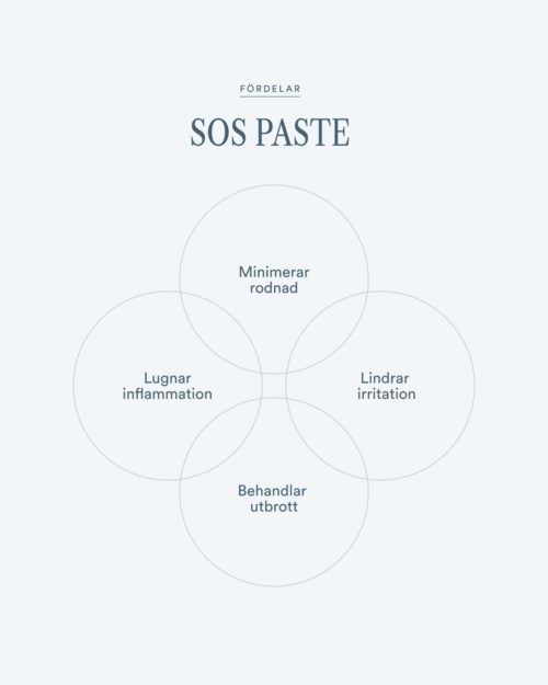 SOS Paste - som du älskar - nu i en ny kostym. Samma pålitliga formulering, bara en uppdaterad look för framtiden. Face Formula SOS Paste är en resultatinriktad produkt för flera olika hudtillstånd, så som tilltäpptheter och utbrott, talgrik och fet hud, lokala finnliknande utbrott och hudirritationer. Med ingredienser som svavel Miniporyl® lugnar den utbrott, rodnad, flagande hud och överskott av talg. Den lugnar huden och ger effektiv vård där den behövs mest. En idealisk SOS-produkt för lokala utbrott. Användning: Appliceras lokalt. Stryk på ett tunt lager SOS Paste på utbrottsområden dagligen varje kväll eller varannan kväll, vid aktiva utbrott. Följ gärna upp med ett lager Essential Formula ovanpå. När resultat har uppnåtts används den underhållande två gånger i veckan på utsatta områden.1 produkt i inlägget SOS PASTE219 visningar - Inlägget skapades 5 månader