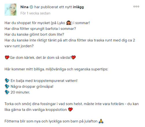 - Inlägget skapades 4 år💥💥BEAUTY HACK NR 8💥💥 🌸DIY/GÖR DIN EGEN HAND/NAGEL/FOT PEELING🌸 🌸Har du torra trötta semesterhänder? Kanske varit ute i grönsakslandet eller varit ute i svampskogen och fått skit under naglarna eller har du bara torra trötta nagelband? SE HIT!🌸 🌸Vi använder peeling till så mycket på vår kropp och vårat ansikte men glömmer ofta bort att våra händer och nagelband kan behöva lite exfoliering de med! Kanske efter att vi arbetat med händerna eller före man ska måla naglarna etc. Då har jag det enklaste knepet här som du kan göra själv hemma utan att behöva köpa några nya dyra produkter! ◼️DU BEHÖVER: ▪️Bakpulver ▪️En handkräm (ta valfri favorit! Ex en lite fetare är att rekommendera men det är upp till dig!) ▪️Några droppar olja (jag har använt olivolja men man kan ta kokosolja, sesamolja, mandelolja etc) ▪️En liten skål/burk att blanda i ▪️En spatel el liknande att blanda ihop med. ▪️En nagelborste 🔹HUR GÖR MAN? 🔸1. Ta fram allt du behöver, sedan häller du ca 2 msk bakpulver i en burk och häller på ca 1-2 msk handkräm. Blanda. 🔸2. Droppa i några droppar (ca 1 msk) olja. Blanda väl! 🔸3. Ta dig till ett handfat (eller varför inte sitta utomhus på balkongen/verandan om du har en sådan! Någonstans där du kan ”klabba” lite!) och lägg lite på din nagelborste och sen kör du på och borstar nagelband, under naglarna och på händerna. Gör samma sak på andra handen! 🔸4. Skölj av och njut utav dina rena exfolierade händer! Kan med fördel avslutas med en handkräm eller nagelolja (du kan ta valfri olja och massera in runt nagelbanden, man måste inte ha en nagelbandsolja för det! Går bra med annan!). 🌸Kan även göras på samma sätt på fötterna! Till händerna använder jag cetaphil (finns tyvärr inte på lyko men de har en bra bodycream från cetaphil däremot som också är kanon!) och till fötterna gillar jag weledas body cream som är en väldigt fet kräm. Till fötterna kan jag rekommendera att blanda i 1-2 msk såpa i mixen med för extra rena fötter!! #babor #beautyhack2021