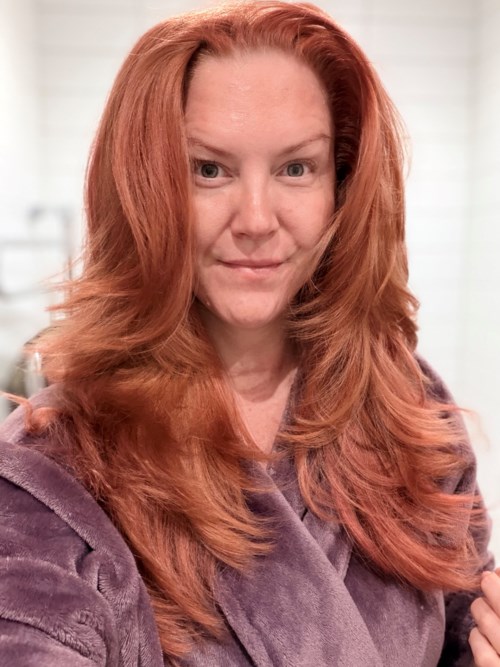 Idag var det dags att fylla på färgen lite. Två tvättar har gjorts sedan senaste färginpackningen och det såg ok ut men jag ville ha mer ”ooumpf” 🤗 Fyra delar Deep copper, fyra delar Ruby red och en del Dark Brown. Därefter utblandat med gradvis mer schampo ju högre upp på huvudet jag kom (tre sektioner). Idag blandade jag ut med ett vanligt schampoo från Dove och det var faktiskt lättare att fördela än med inpackning/balsam 👍🏻 Sedan schamponerade jag två gånger, i med balsam och därefter Schwarzkopf fiber sealer. Fönat med fönborsten från Revlon (kanske får omvärdera den faktiskt ✨ ) och lite Color wow Raise the root i överhåret och luggen. #bylyko #dove #schwarzkopf #revlon #colorwow7 produkter i looken Påfyllning i rött 🥰 - Inlägget skapades 4 dagarBetyg: 5 av 5