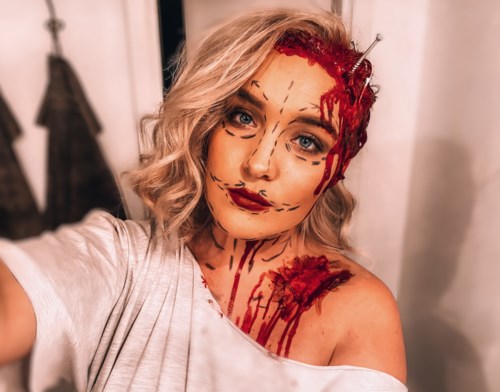 By bad, I mean really bad... En enkel men ack så tidskrävande halloween make, som enbart gjord för att få några snygga bilder haha 👻 Startade med att göra en festlig make, lockade hela håret och såg ut som jag skulle på partaj. Målade sen dit alla streck i ansiktet och kroppen. För första gången någonsin testade jag att använda mig av vax, vilket var lite svårt men det föll på plats tillsist. Flätade små flätor på ena sidan av håret för att få en ojämn och ”skadad” look, fäste fast alla skruvar i både flätorna och i vaxet. Sen var det bara att gå loss med fakeblod, vilket var min favoritdel av allting! Och ta da ⚒ #Halloween20205 produkter i looken Beauty surgery gone bad ⚒1707 visningar- Användarens roll: Lyko Creator.Kommentaren lades 5 årHaha det stämmer Jessica, det var blod överallt som sögs in i både hår, väggar och handfat 😂 så ja jag fick tillsist färga håret och måla över i badrummet då färgen vägrade släppa! Kan lova att det inte blir något blodigt i jultävlingen om ens någon mer gång 😂 men jag ser verkligen fram emot jultävlingen, ska bli kul att se vad dom har tänkt ut för regler/tema osv 😍 hoppas ni med ska vara med och tävla!2 gillar