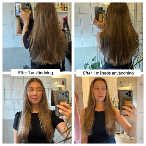 Mitt hår: Jag har tunt, fint nordiskt hår. Mörkbrunt med lite solblekning. Jag har aldrig använt någon hårkur eller liknande. Min hårvana innan jag började med detta set var schampo x2 och balsam. Det gjorde jag 1-2 gånger i veckan. Glasflaska med pump och fint design? Oh-la-la! Jag har inte använt detta varje dag, som bruksanvisningen anger, helt enkelt för att jag har glömt bort den lite. Och lite för att jag var rädd att håret skulle bli för glansigt. De dagar jag använder den har jag tagit 2 droppar, värmt upp i händerna och sedan spridit det i topparna av håret. Oljan tränger snabbt in och är inte märkbar i håret kort tid efter, men vilken skillnad det gör på topparna! Tidigare var mina toppar ganska torra, och jag hade aldrig använt några produkter specifikt på dem. Jag hade faktiskt övervägt att gå till frisören för att höra om tips, ända fram till dess att denna räddning kom med posten! All frizz försvinner och glansen kommer tillbaka. Denna ska jag njuta av (och spara på med tanke på priset) så mycket som jag kan tills den är tom! Sammanfattande bedömning av serien: Jag glömde att ta före- och efterbilder av mitt hår, men det var helt enkelt för att jag inte hade förväntat mig någon stor skillnad. Men OMG, jag hade aldrig trott att mitt hår kunde bli så friskt och fint som det har blivit! Bildet märkt «1» togs efter första användningen, bilden märkt «2» togs efter 1 månads kontinuerlig användning! Min slutsats med denna serie är att håret får mycket mindre frizz, märkbart mindre brott och mer hälsosam tyngd. #LYKOINFLUTESTER #LOREALPRO1 produkt i inlägget Hej då frizziga toppar!639 visningar - Inlägget skapades 11 månaderBetyg: 5 av 5Verifierad testare