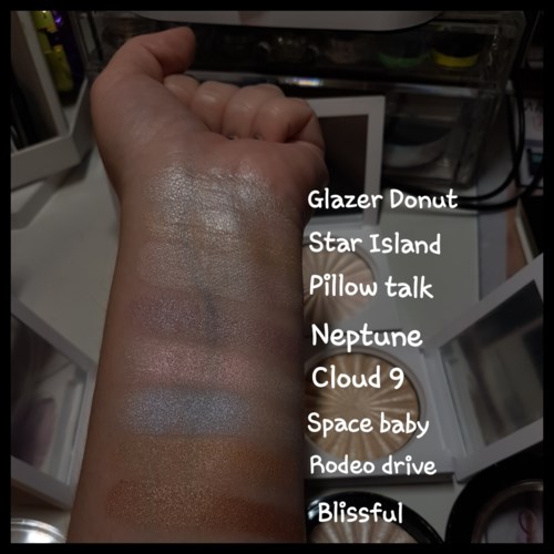 Här kommer lite swatches & bilder på alla 8 olika ofra Highlighters jag har så ni kan se skillnader. Alla har samma fantastiska kvalité. Tyvärr inte dom glammigaste swatcharna men man ser då skillnad. Ofra är så grymma på Highlighters och denna är inget undantag. Jag äger de flesta ofra highlighter färger och alla har samma härliga formula med helt sjukt glow. Sammetslen formula. Den är PERFEKTION 🌟💖 Superfin och samma ofra kvalité som alltid med de sjukaste glowet. Detta är inte en typisk "vardagshighlighter" utan detta är liksom wawawooom gloow de sjukaste glowet 🌟🤩💖 mina absoluta favorit highlighters då jag verkligen vill ha sjukt glow. Tips spraya penseln med lite settingspray och applicera highligtern och då lyser det ändå till månen 🌜 Om man vill ha extra glow. #Tävling #OFRA1 produkt i inlägget Pillow talk min favorit 🌟🤩💖 - Användarens roll: Lyko Creator.Inlägget skapades 5 årBetyg: 5 av 5
