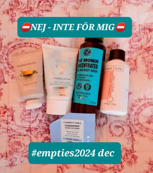 Liiite mindre #empties än vanligt för mig den här gången men ändå mycket som tog slut! Bland favoriterna ligger bara sånt som jag köpt flera gr eller kan tänka mig att köpa om🙂 Det mesta har jag recenserat om det finns här på Lyko😊 Här är några av dem: 👌FAVORITER👌 👌Dr. Ceuracle "Vegan kombucha coffee bean scrub" - härlig kroppsskrubb med kaffedoft. 👌Grow Gorgeous "Intense hair serum" - Milt doftande hårserum för att stimulera hår som börjat bli tunt. 👌By Wishtrend "Hydra enriched ampoule" - skönt fuktserum. 👌Ann-Marie Börlind "3-in-1 facial oil" - ljuvlig ansiktsolja med skydd mot blått ljus. 👌Bareminerals "Phyto Retinol lip mask" - läppmask med bakuchiol som räckte i exakt ett år så trots att den var svindyr i inköp var den inte dyr i längden (bara en skönhetshoarder kan resonera så😉). Och till sist en jättebra, päronsplittsdoftande gelkräm som jag ändå EJ kommer att köpa igen då märket tyvärr testar på djur👎: ✖Some By Mi "Beta panthenol repair cream" (fick den i en importerad adventskalender). 🤔OK - MEN KÖPER KANSKE INTE OM🤔 🤔Petitfee "Agave cooling eye mask" - satt perfekt men gav inre så bra effekt tyvärr. 😧PROVER SOM EJ LOCKAR TILL KÖP😧: 😧Is Clincal: "Youth eye complex" - ögonkräm som inte gav tillräckligt med näring till min torra ögonhy men tog ned svullnad ok. 😧Mary & May: "Tranexamic acid eye cream" - ögonkräm som irriterade och gav svullna ögonlock🤥 ⛔NEJ - INTE FÖR MIG⛔ ⛔Dermosil: "Nail & Cuticle peeling" nagelbandspeeling som var alldeles för oljig för min smak så att det inte gick att tvätta bort peelingkornen. - Första produkten jag ogillar från finska Dermosil som har väldigt bra grejor för känslig hy till bra priser👍 Allt är dessutom gjort i Finland el Norden, mycket är veganskt, mycket är oparfymerat och inget testas på djur🐇🐀🐒🐶👏🏻 - Så då kämpar vi skönhetshoarders på ännu ett år med våra gömmor av produkter 🛍🧴🧴 🧼👝 som ska bli #empties . Förhoppningsvis lär vi oss NÅGON gång att göra slut på det vi redan har innan vi impulsköper nytt😉 vilket är hela tanken med det här projektet. Stort tack till Malin Malinadenfina som startade det och #projectpan här på Social🙏💜 #empties2025 januari - Inlägget skapades 10 månader
