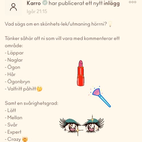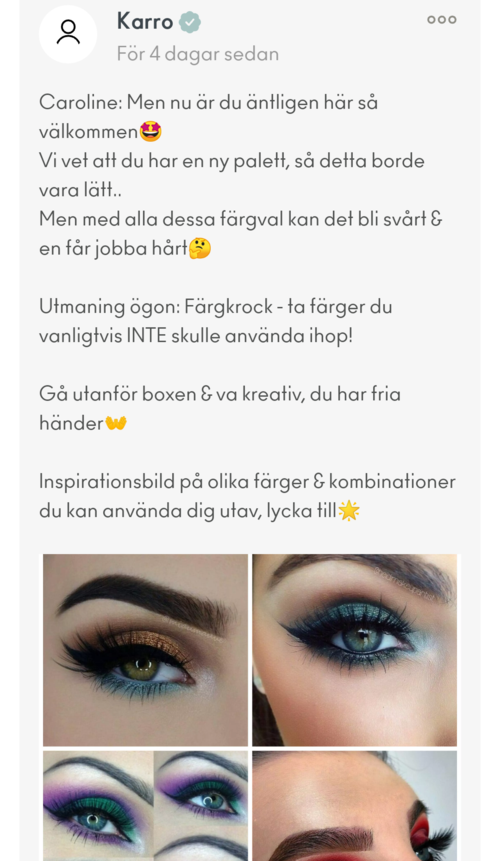 - Inlägget skapades 5 årHeej👋 @Karro här på social har startat en liten skönhets-lek/utmaning som jag tycker verkligen var ett roligt initiativ, lika här kan man lära sig mycket om sig själv samt att kanske just utmana sig själv lite grann. Kika gärna in där och var med ni som vill😍helt valfritt ❤️ Jag valde ögon och läppar men tiden fanns bara till att köra en utmaning idag och det var just: ⭐Utmaning läppar: Mermaid lips - du har fria händer! Jag ville att Karro skulle välja utmaning åt mig, så jag tycker ändå att jag lyckades hyfsat för att vara första gången 🤗 Sen är det såklart en lite sämre mobilkamera😭är mycket snyggare färger irl,har därför försökt tagit kort i olika ljus, sen så är jag en skakis så vissa bilder kan vara lite suddiga men ändå, Vad tycker ni? Klarade jag utmaningen angående läpparna? 🤭 Hur som helst tycker jag detta är superkul och ser fram emot o göra nästa utmaning som är ögonen och ska återskapa, läs försöka, återskapa en moln look☁️ Ha en fortsatt fin kväll👋👋 #utmaning