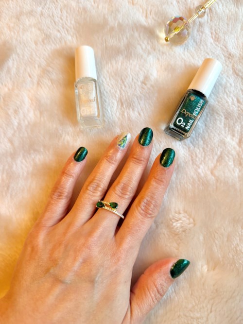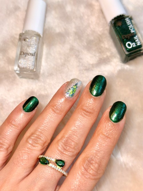 Wearing 2 shades from Dependcosmetic O2 Christmas collection: 🎄Spell of the Grinch, A forest green shimmer ✨ Santa’s Takeoff, a silvery gold with blue iridescent glitter Both very opaque at 2 coats. I topped it with the new Mirror Gloss Top Gel that I guess is going to replace the old gel topcoat as that one is not available anymore. I love it as it dries very fast and provides glossy and smooth finish.