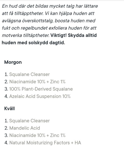 beställde precis hela kitet som behövdes vid oren/oljig hy enligt den hjälp guiden på the ordinarys sida här. men köpte även Hyaluronic Acid 2% + B5 OCH Granactive Retinoid 2% Emulsion. hur kan jag klämma in dessa 2 till hudvårdsrutinen utan att olika syror m.m krockar?🤯😅 Mvh Ida1 produkt i inlägget hjälp2298 visningar- Användarens roll: Farmaceut på Lyko.Kommentaren lades 4 årHej Ida 🌼 Vad kul att du via guiden hittat en rutin som passar dig 😊 Jag utgår ifrån att du menar både morgon och kvällsrutinen så här kommer mitt förslag på hur du kan få in dessa produkter som du köpt till: Morgon🌛 1)Squalane Cleanser 2)Hyaluronic Acid 2% + B5 3)Niacinamide 10% + Zinc 1% 4)100% Plant-Derived Squalane 5)Azelaic Acid Suspension 10% 6)Solskydd - så viktigt, inte minst när man använder aktiva produkter i sin rutin🌞 Kväll Alt 1🌛 1)Squalane Cleanser 2)Mandelic Acid 3)Hyaluronic Acid 2% + B5 4)Niacinamide 10% + Zinc 1% 5)Natural Moisturizing Factors + HA Kväll Alt 2 🌜 - denna rutin kan du köra 1-2 kvällar i veckan så du får in retinolet och sakta vänjer huden vid produkten 👌🏽 1)Squalane Cleanser 2)Hyaluronic Acid 2% 3)Niacinamide 10% + Zinc 1% 4)Granactive Retinoid 2% Emulsion 5)Natural Moisturizing Factors + HA (vid behov) Är det bara guiden från morgon, som du har med på din bild, du klickat hem så rekommenderar jag dig att lägga till Natural Moisturizing Factors + HA de kvällar du använder Granactive Retinoid 2% om du känner att det behövs och alltså inte använder Azelaic Acid Suspension 10% för att inte riskera att irritation uppstår 🙏🏽 Önskar dig stort lycka till och återkom gärna vid fler frågor/funderingar 🌺 Ha en riktigt härlig dag 🦋