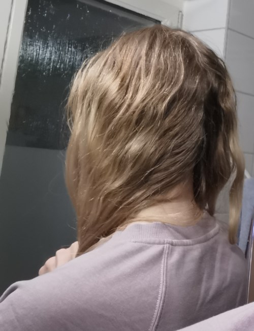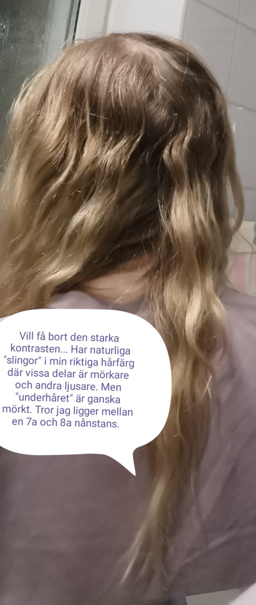 Hej! Jag har färgat och blekt mitt hår i flera år. Har nu bestämt mig för att sluta bleka håret då det är skadat och torrt. Har inte blekt håret på cirka ett år. Håret är kortare på vissa ställen än andra, antagligen har det gått av efter tidigare blekningar. Vill ha hjälp att hitta en färg som ligger närmare min naturliga och funderar på om OTC 8.23 Ljusblond Iriserande Guld kan fungera men är rädd att håret ska bli mörkbrunt... Mitt naturliga hår är typ mörkblont men med naturliga slingor där vissa delar är relativt mörka och andra relativt ljusa. Mitt hår blir också väldigt solblekt på sommaren och nästan ljusbrunt på vintern. Bifogar massor av bilder på hur håret ser ut nu och hur min naturliga färg ser ut. Hoppas ni kan hjälpa mig ❤️ stort tack