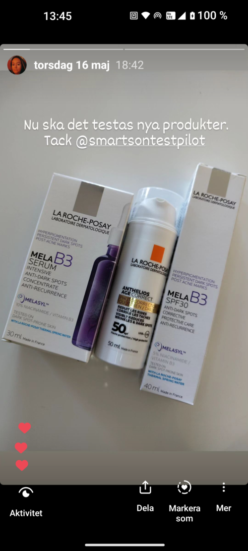 Väldigt behaglig och fin produkt. Går in jättefint i huden utan att bli kladdig. har använd denna på morgonen i en vecka nu och Mela B3 Creme på kvällarna. Väntar på att se före och efter.1 produkt i inlägget Har förhoppning om denna produkt195 visningar