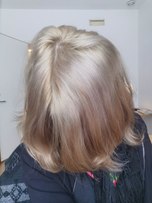 Hemmablekt hår som i vanlig ordning blivit gult, och med gammal rosa färg på underhåret. Under verkningstiden blev jag orolig att håret skulle blir grönt då det såg ut så, men ser själv inget grönt nu. Fick tips från Lyko om att lägga i färgen i fuktigt hår, då den är pigmentrik, vilket jag gjorde. Är nöjd, den fixade det värsta efter min blekning. Extra bra med två omgångar toning i en förpackning.1 produkt i inlägget Nöjd9077 visningar