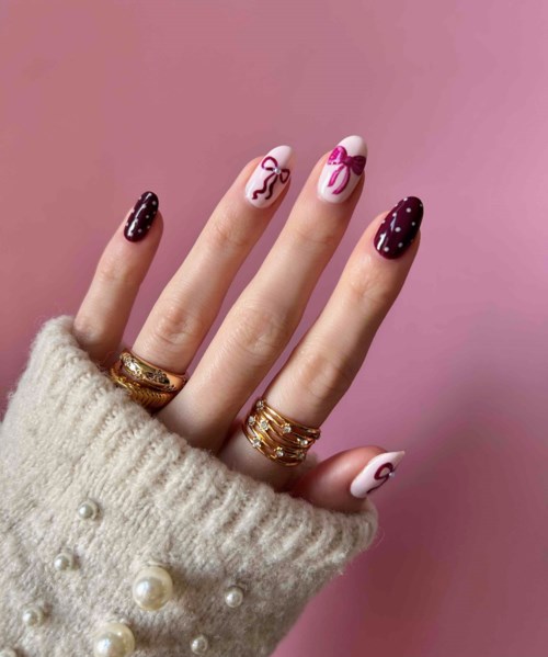 Jag har varit helt besatt av rosetter på sistone, och kunde därför inte låta bli att inkludera dem i min nagelkonst. 💖 I kombination med den ständigt populära burgundy. 🥀6 produkter i looken Valentins nagelkonst inspiration 🎀Mara