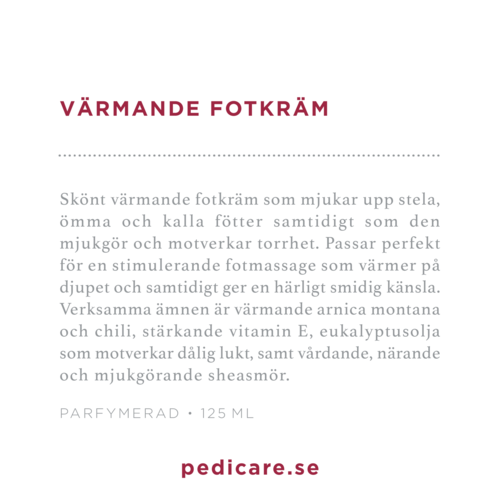 - Inlägget skapades 4 årHar du ofta kalla fötter? Mysiga, sköna sockor i all ära men ibland vill man ha det lilla extra. Pröva Pedicares värmande fotkräm som med hjälp av örten Arnica hjälper blodcirkulationen att komma igång och lite chili som ger en värmande effekt. Myskvällarna är nu säkrade fram till sommaren kommer!37 visningar
