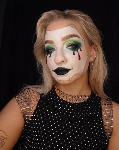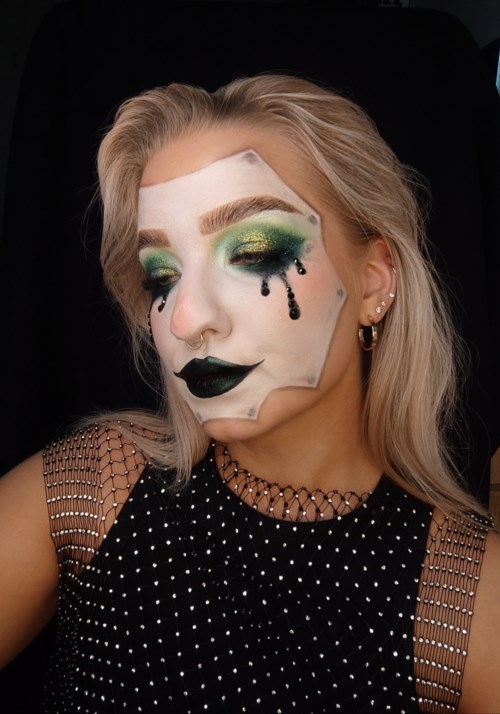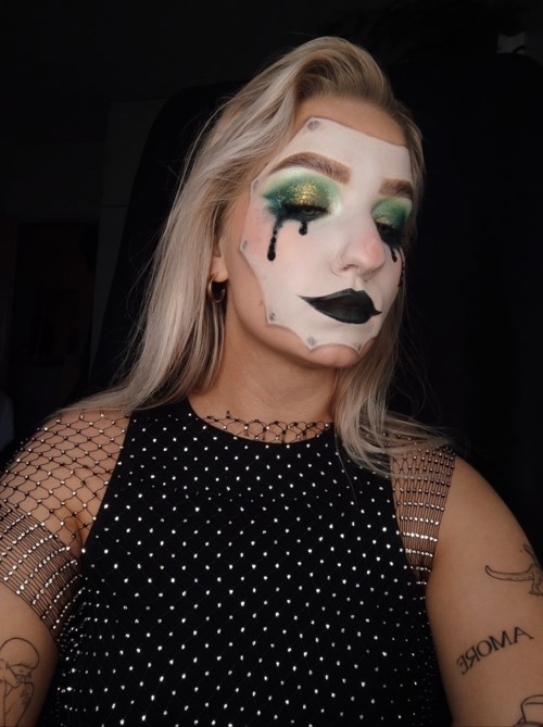 Jag började med att rita konturerna till “masken” med en ljus eyeliner. Sedan fyllde jag inramade området med en krämfärg och finslipade konturerna till slut med en mindre borste. Jag hade redan fixat ögonbrynen innan jag påbörjade med ansiktet! Jag fixerade den vita färgen med ett transparent löspuder. Det är viktigt att fixera krämfärger med puder, så att färgen hålls där den ska! Jag fortsatte med ögonsminkningen och började med att applicera en massa glitter! Sedan applicerade jag lösfransar i yttre ögonvrån och en liten del jag klippt av på nedre fransraden. Du kan fritt välja färgen på ögonsminkningen eftersom vi kör med en vit bas! På detta vis får du färgerna fram extra fint 🤩 Till slut applicerade jag rouge på kinderna och näsan med lite highlighter. Efter detta valde jag en något mörkare färg för att skapa djup och konturer till “masken” och ritade även små skruvar i hörnet. 😁 Sedan skissade jag ut tårarnas konturer med kajal och fyllde dem med svart färg. Till slut fäste jag några strass-stenar ovanpå tårarna med franslim 🖤 På läpparna applicerade jag en svart krämfärg och ritade en betydligt längre läppkontur. Till slut sprayade jag rejält med fixeringsspray och så var sminkningen klar för halloween! (psssst. if you have any questions, please ask in English hahah 😁💕) #Halloween22 #nyxprofessionalmakeup13 produkter i looken ✨🖤 Clown 🖤✨Roosa