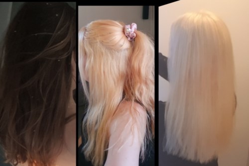 1 är Före bild, 2 är efter första blekningen & bild 3 efter andra färgningen. Håret kändes mjukt efteråt inte alls så slitet som jag trodde det skulle bli! 👍1 produkt i inlägget Toppen!Sandra
