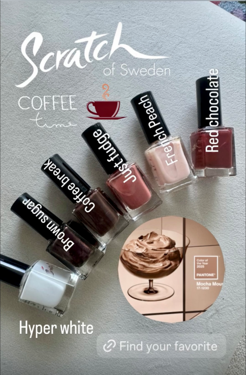 Varje år utser Pantone årets färg. 2025 heter den Mocha Mousse. Hos SCRATCH heter den JUST FUDGE och har nummer 304. Det finns fler färger i vårt sortiment som lever upp till färgpaletten ”Kaffe chokladmousse och Fudge” #scratchofsweden #coloroftheyear #pantone #pantone2025 #colouroftheyear #color #colour #nailpolish #nagellack #vegan #crueltyfree #friendlyformula6 produkter i looken COLOR OF THE YEAR 2025936 visningar- Användarens roll: Lyko Creator.Kommentaren lades 11 månaderSåååå snyggt!!!! Min favorit där blev visst slutsåld 🙈1 gillar