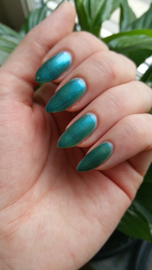 Denna färgen är en sjöjungfruns dröm, helt underbar. Men efter tre lager var den ändå inte helt täckande. Jag skulle föreslå en liknande grön under som basfärg och sen denna över för att få den subtila skimmereffekten. Hade det inte vart för den tunna formulan så hade det varit en femma #tävling1 produkt i inlägget Underbar färg men tunn formulaJudith