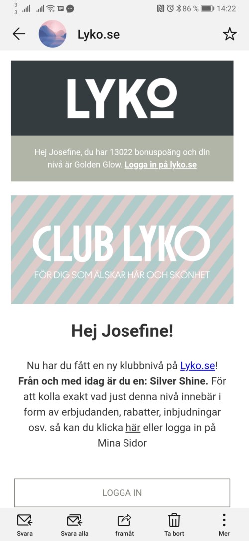 - Kommentaren lades 6 årHej Josefine! Återkom gärna till oss på fraga@lyko.se så ska vi självklart kika på hur det ser ut 😊👍