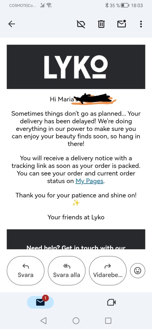 Måste säga att det är första gången jag är lite glad över en försening. Jag kan ändå inte ta emot beställningen just nu. Dock väldigt ovanligt. Just lovables brukar de skicka fort även om deras andra paket kan dröja och ofta levereras lite senare än deras app påstår, åtminstone om det är gratisfrakten. Har fått lovables beställd med normal (gratis) frakt snabbare än en beställning med betald Express frakt som beställdes dagen innan..
