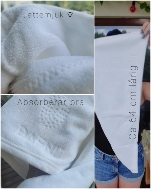 Denna hårturban har ett fluffigt och gosigt material som absorberar vatten bra! Men det jag gillar mest är att den sitter där den ska. Tycker många hårturbaner åker på sniskan och tillslut orkar man inte ha på dom mer. Denna sätter man fast, som så många andra, med en ögla och knapp och den sitter på plats i flera timmar om så önskas. Det enda jag hade velat var att den skulle vara liiite längre. Den är ca 65 cm lång och mitt hår går ned över brösten, vilket gör att det blir en liten söt toffs som hamnar utanför, om man inte viker in det överflödiga håret förstås :) #DAFNI #TESTBYLYKO231 visningar - Användarens roll: Frisör på Lyko.Inlägget skapades 3 årBetyg: 5 av 5