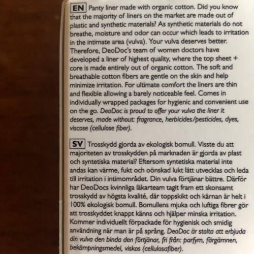 Den här gången har jag testat produkter från #DeoDoc – först ut är supertunna trosskydd i ekologisk bomull! 🗳 24 st, i förslutningsbar snygg kartong. Eftersom skydden är singelförpackade är de enkla att ta med i väskan, fickan, eller plånboken (har så sällan kontanter i min, så i det facket har jag istället alltid några plåster & nu trosskydd!). Skydden är så pass tunna & bekväma att de i princip inte känns, och funkar (för mig) bra under sista fjuttiga mensdagen, till flytningar, samt som extra försäkran ifall en tampong inte skulle räcka hela vägen. 🏃♀️🩸 Ytterligare ett användningsområde är i ”botten” av bh-kuporna, såna där dagar då underboob sweat är oundvikligt 🙃 💰 De trosskydd jag brukar köpa kostar ca en tredjedel av denna låda (och innehåller 8 fler), men eftersom de här i bomull ~andas~ på ett helt annat sätt & knappt känns tycker jag att det lite högre priset känns befogat. #lykoinflutester280 visningar- Kommentaren lades 3 årDe lät bra👍 Så skönt med bomull tycker jag så man slipper den irritation som gärna kommer efter X antal år med plastprodukter!1 gillar
