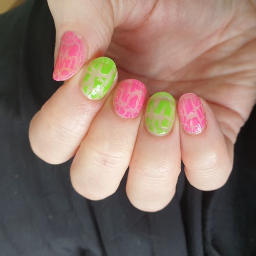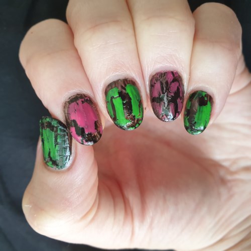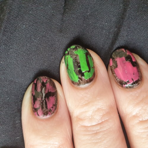 testade först ovanpå svart och det blev inte så bra, färgerna blev urvattnade (ser värre/tråkigare ut i verkligheten än på bilden), det sprack upp i stora chunks och lacket under åkte liksom med så det blev fula spår där nageln syns igenom och på vissa ställen till och med sprickor. svårt att städa upp kanterna snyggt med så ojämn täckning! kanske hade blivit bättre om jag målat två lager svart, men det är täckande på första lagret så tänkte att det skulle funka. och jag följde instruktionerna! 😄 passar nog också bättre tillsammans med ljusa färger eftersom crackled-lacket inte var helt täckande i sig? försök två: ett ofärgat lack som botten. tycker det blev jättefint! sprickorna blev mycket jämnare och finare och färgerna blev lysande neoniga precis som i flaskan. detta kommer jag använda igen, och testa med fler färger under! hade önskat mig att det fanns ett svart lack som cracklar också, älskar att kombinera svart med glada färger och/eller neon. jag använde: barry m - peel it! base coat orly - liquid vinyl (vänster) essence gel nail color - gloss 'n roll (höger) depend crackled - tickled pink depend crackled - lucky clover essence - speed dry top coat okej pensel och fin lättflytande konsistens. gillar inte depends pytteflaskor dock, känns alltid som att jag ska råka välta dem under målningen och korken/penselskaftet är så fjuttigt att hålla i. inte bra för såna som har greppsvårigheter. 💡TIPS: sätt fast flaskan i bordet med en klutt häftmassa + sätt ett tjockt gummiband runt korken så går det lättare att måla (och öppna) utan att tappa greppet!1 produkt i inlägget bra med rätt grundfärg men fjuttig/svårgreppad flaska (som vanligt)366 visningar