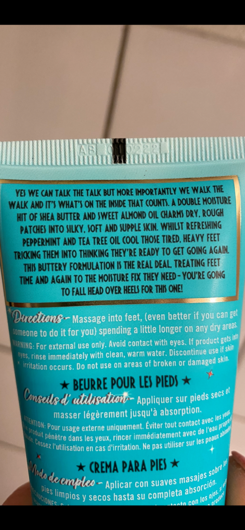 En intensivt närande behandling för fötter med en fuktgivande blandning av återfuktande sötmandelolja och sheasmör för att motverka torr och grov hud. Pepparmynta och tea tree-olja hjälper också till att stärka trötta, ömma fötter och lämna dem fräscha, mjuka och supersläta.