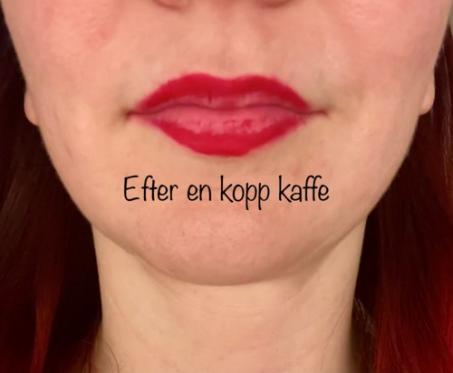 Jag tycker personligen att det är svårt att applicera mörka läppstift, och det här är inget undantag. Penseln får med sig lite för mycket färg och är dessutom rätt mjuk, vilket gör att det är svårt att ”hålla sig innanför linjerna”, så det är nästan ett måste att skrapa av lite innan man applicerar den. Läpparna känns rätt torra och liksom stela av produkten, tyvärr. Har man ingenting emot att bättra på det rätt ofta är det absolut inga problem, men som ni kan se försvinner större delen av färgen efter en kopp kaffe. Däremot är det väääldigt svårt att få bort produkten från konturerna 😅 Krävs både sminkremover och toner för mig, så där snackar vi nog 8h hållbarhet, men tyvärr inte i sin helhet. Eller kanske om man varken äter eller dricker under tiden… Synd, för färgen är väldigt fin!2650 visningar - Inlägget skapades 3 årBetyg: 4 av 5Verifierad köpare