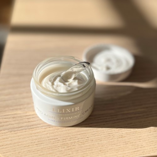 Pro Aging Firming Cream är en näringsrik kräm med aktiva pro age-ingredienser som ”väcker upp” och ökar nivåerna av proteiner som är viktiga för cellproduktionen i huden, för en mer välmående hud med förbättrad spänst. Krämen innehåller ”Elixir Longevity Complex” – ett komplex som innehåller innovativa och aktiva ingredienser. NMN; reparerar och förnyar celler som förebygger och minskar åldrandeprocessen. Revinage; som har en retinolliknande effekt, men utan eventuella biverkningar, minskar synlighet av fina linjer och rynkor och ger en jämnare och slätare hud. Resveratrol; en kraftfull antioxidant som bland annat bekämpar fria radikaler och UV-strålar, och minskar ålderstecken orsakade av miljöpåverkan. Pro Aging Firming Cream förbättrar fukthalten, skyddar huden och stärker upp hudens naturliga cellförnyelse, stimulerar produktionen av kollagen, stärker hudbarriären och bidrar till en förbättrad vitalitet i huden. Konsistensen är rik och smälter in i huden och lämnar den smidig, slät och mjuk.