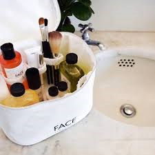 Vår vackra svarta necessär Sky Bag är av mjukt nylontyg. Den har vita kanter, ett kort handtag, en bra dubbeldragkedja och gott om plats att packa och förvara vad du än tar med dig på din resa.