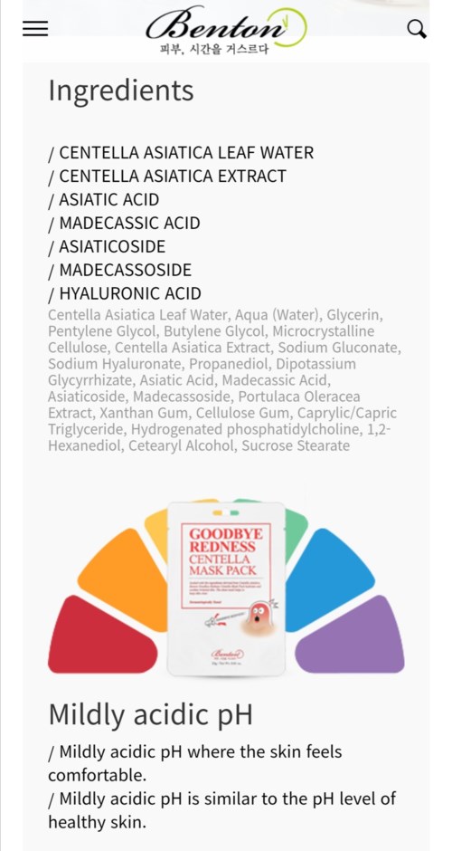 Lindra stressad och irriterad hud med denna svalkande arkmask baserad på hela 45% extrakt av centella asiatica (en populär ingrediens i koreansk hudvård) som mjukgör, lugnar och reparerar samtidigt som den återfuktar huden tillsammans med hyaluronsyra. Denna ansiktsmask har ett något surt pH-värde på 6 för att balansera hudens naturliga pH för en hälsosam och välfungerande hudbarriär.