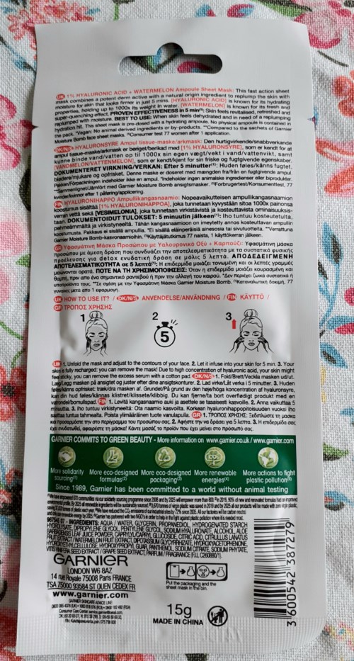 Den snabbverkande arkmasken är berikad med [1% HYALURONSYRA], som är känt för att kunna binda vatten upp till 1000x sin egen vikt i vatten, samt [VATTENMELON], som är känt för sin friska och fuktgivande egenskaper. DOKUMENTERAD VERKAN: Efter 5 minuter(1): Huden känns återfuktad, mjukare och uppfriskad.