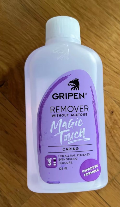 GRIPEN® Remover Magic Touch utan aceton är utvecklad för att vara både effektiv och skonsam mot nagel och nagelband, med ett uppdaterat recept utan parfym. På Gripens 4-gradiga skala är denna produkt 3 i styrka vad gäller effektivitet.