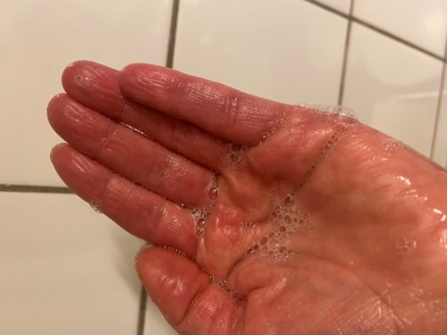 Skölj händerna i varmt vatten. Pumpa ut lagom mängd tvål. Jobba upp ett ordentligt lödder. Tvåla in hela händerna; alla fingrarna, handflatorna, ovansidan av händerna, mellan fingrarna, naglarna och handlederna. Tvätta i minst 15-20 sekunder. Skölj sedan av. Torka ordentligt.