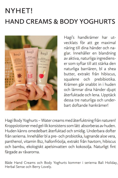 Som Lykoinflutester fick jag i uppdrag att testa tre produkter från märket Hagi som kommer från Polen! Här kommer nu mina tankar och upplevelser om Hagi Natural Hand And Nail Cream Bali Holiday 50 ml! Lite om mina händer: normal/kombinerad hud, inga större problem med torrhet. Däremot mina nagelband har större behov av extra omvårdnad! Tubförpackningen är riktigt fin och lagom stor, smidig att ha med sig i väskan! Lätt att öppna och trycka ut formulan! Formulan har en lagom konsistens, doftar så himla gott! Är riktigt förtjust i den! Lite kryddig men frisk fräsch somrig doft av citrus, cederträ, salvia och jag tycks uppleva lite vanilj! Egenskaper som återfuktar är gurka, bambu och hibiskus, innehåller också biotin för att stärka naglarna och vårdande sheasmör! Mina händer har absolut fått ett bättre mående under testperioden! Mer lyster och mjukare! Mina nagelband upplevs också starkare! Dock kan jag inte svara på hur och om mina naglar stärkts under denna tiden då mina naglar är rätt starka redan. En mycket dryg produkt och priset är toppen! Jag kommer absolut fortsätta köpa denna underbara fina handkräm! #LYKOINFLUTESTER #HAGI14620 visningar- Användarens roll: Lyko Creator.Kommentaren lades 1 årTack vackra @Jessica du är gullig Kramis ta hand om dig🥰🌸1 gillar