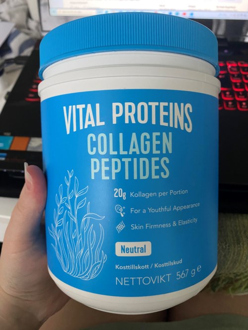 Vital Proteins Collagen Peptides är ett bovint kollagentillskott i pulverform. Det är neutralt i smaken och perfekt att tillsätta i både varma och kalla drycker som kaffe, te, smoothies med mera. Vital Proteins Collagen Peptides innehåller kollagen för ett ungdomligt utseende, hudens fasthet och elasticitet. Med hjälp av Vital Proteins kan du förse din kropp med högkvalitativt kollagen så att du kan nå dina wellnessmål – oavsett hur de ser ut. -För ett ungdomligt utseende, hudens fasthet och elasticitet -100% hydrolyserat kollagen -Högt proteininnehåll (90%) -Smak- och luktneutral -Blandas enkelt i varma och kalla drycker -Stödjer normal muskel- och benhälsa* *Kollagen är ett protein. Protein bidrar till att bibehålla muskelmassan och normal benstomme.