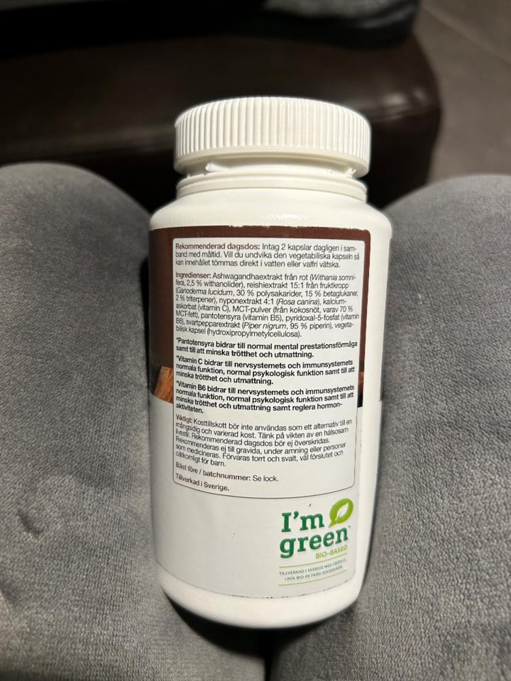 Premium Ashwagandha en högdoserad produkt med den välkända indiska örten ashwagandha (800mg/dagsdos) kombinerad med adaptogenen reishisvamp i form av ett reishiexktrakt från fruktkroppen med ett 15:1 förhållande. Detta ger ett intag av motsvarande 3000 mg reishipulver per dagsdos. Reishiextraktet innehåller även 30 % polysakarider, 15 % betaglukaner och 2 % triperpener. Även de viktiga B-vitaminerna B5 och B6, syraneutral C-vitamin, nyponextrakt 4:1 och piperin. Denna produkt är noga sammansatt med syftet att ingredienserna ska förstärka effekten av varandra och ge bästa möjliga effekt för att bibehålla den mental förmågan och motverka trötthet, stress och utmattning.