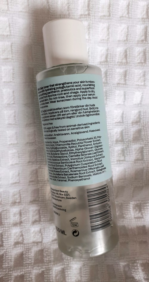 Dagligt ansiktsvatten som stärker din huds mikrobiom, plumpar och återfuktar huden och bidrar till en jämnare hudton. Innehåller fuktgivande polyglutaminsyra, närande och lugnande panthenol, prebiotika samt superfood-extrakt från olika lugnande växtextrakt samt uppljusande lakritsrot och barriärstärkande chaga. Applicera på torr, rengjord hud. Klappas in i huden i ett eller flera lager eller appliceras med hjälp av bomullsrondell. Skölj inte av, applicera sedan ditt serum eller din fuktighetskräm. Undvik ögonområdet.