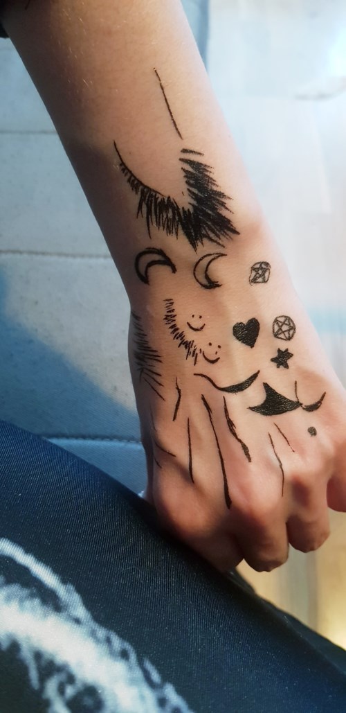 Testade/Tränade på min hand först och ritade sen en fejktatuering. Felt tippet gör så man kan göra riktigt snygga penseldrag samt smala linjer. Väldigt svart, spricker inte, enkel att använda, fläckar inte av (bra makeupremover behövs). Älskar den och kommer köpa igen #tävling1 produkt i inlägget Ny favorit1649 visningar