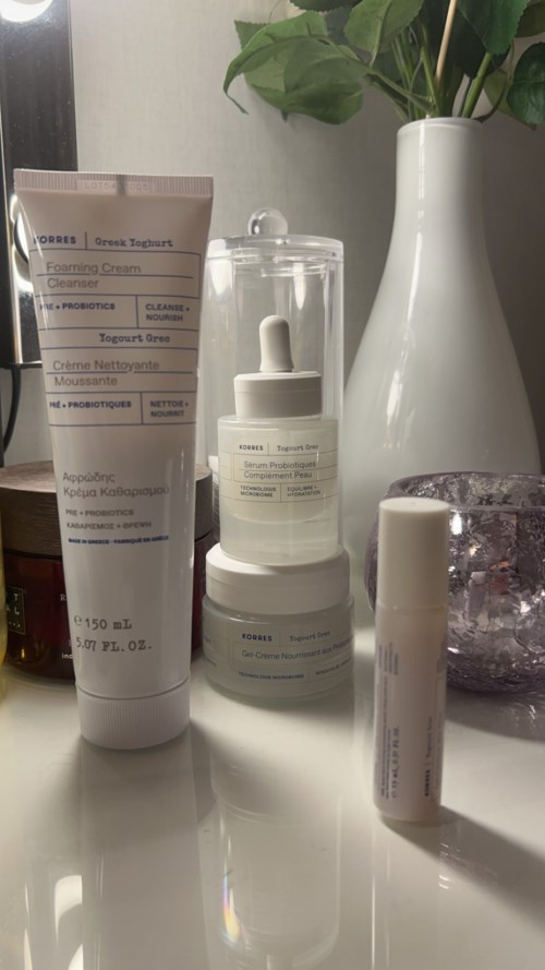 Jag har fått möjligheten att testa #korres Greek Yoghurt-serie som #lykoinflutester Jag har blandhy, och beroende på väder och vind kan jag bli yttorr (främst vintertid ❄️). Probiotic skin-supplement serum innehåller E-vitamin och ska ”förbättra utseendet på skavanker och gör huden mjuk”. Jag upplever inte att den suddar ut några skavanker, och jag tycker att serumet lägger sig snarare som en hinna på huden än att jobba sig in i huden. Den doftar ganska starkt, och jag kopplar ihop doften med ett nystädat hotellrum i Grekland - vilket jag har svårt att avgöra om det är positivt eller negativt. Den luktar fräscht, men vill jag lukta som en städprodukt? Eller är det städprodukter som luktar serum? 🧐 Lite för svår produkt för min smak tyvärr, och därför får den bara 1 ⭐️. Och den stjärnan får designen av produkten stå för, en ganska ”bulkig” glasflaska med pipett. Stilren till utseendet med vitblå färger 🇬🇷975 visningar - Användarens roll: Lyko Creator.Inlägget skapades 1 årBetyg: 3 av 5Verifierad testare
