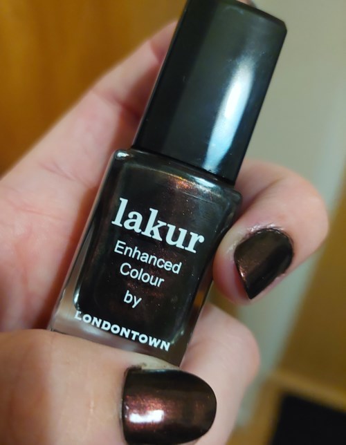 Väldigt hållbart och täckande nagellack. Färgen är brunaktig, med lite röda och lila toner (mest lila). Jag hoppades att den skulle gå mer åt det brunröda hållet, men jag är ändå nöjd. #londontown #lakur #nailpolish #tävling1 produkt i inlägget Cockney Glam