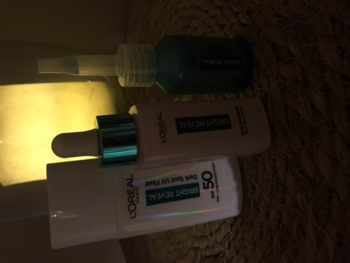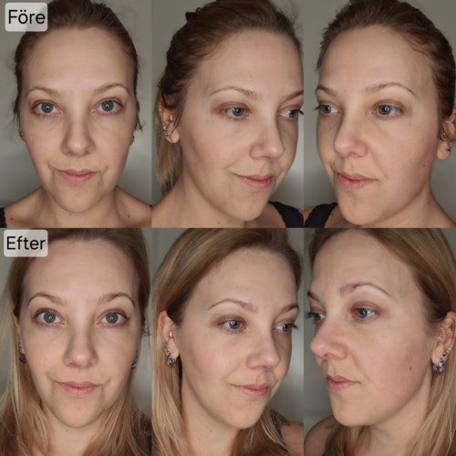 Har fått testa tre produkter från serien Bright reveal gratis via Smartson under 2 veckor. Har använt produkterna i kombination med varandra, så svårt att veta vilken produkt som gjort vad, men ska berätta om min upplevelse av produkterna. Lite om min hudtyp: Kombinerad hy med viss yttorrhet Har keratosis pilaris vid kindbenen Pigmenteringar pga solskador, framförallt runt ögonen och på överläppen. Enligt rekommendationen har jag använt den här exfolieringen varannan kväll. Förpackningen är lite spännande. Spetsen är mjuk, så när man skakat flaskan horisontellt så kan man trycka ut produkten genom att klämma på den mjuka delen. Färgen är häftigt turkosaktig och har inte använt nåt liknande förut. Jag applicerar ett tunt lager på torr, rengjord hy och undviker ögonområdet, munnen och runt näsborrarna. Strax efter känner man att huden börjar pirra och kännas kall, så produkten är verkligen aktiv! När exfolieringen verkat på huden i 15 minuter ska man torka bort överflödig produkt och sedan tvätta bort resten. Upplever ibland att det trots det kan svida lite i ögonen när jag tvättar av det, så viktigt att torka av noggrant före och tvätta ordentligt efter. Efteråt känns huden kylig och något stram, vilket är en mindre skön känsla på kvällen, men märker verkligen hur porerna på näsan blivit renare och texturen från keratosis pilaris minskar direkt! En dröm att applicera produkter ovanpå! På bilderna kan ni se före och efter. Har inte fått några extra blemmor eller så, vilket jag vanligtvis kan få när jag testar nya produkter. Tror dock att man ska vara försiktig om man har en känslig hud. Rekommenderar till dig som har samma hudbekymmer som jag!