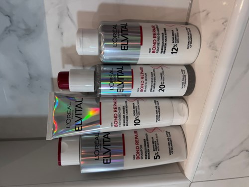 Elvital Bond Repair Conditioner är ett balsam för alla typer av skadat hår. Återuppbygger bindningar i hårets struktur och reparerar hårstrået från fjällskikt till cortex**. Ett hårstrå är uppbyggt av miljontals bindningar som ger det struktur och styrka. När vi belastar håret genom borstning, blekning, värmeredskap och färgning blir hårstrået svagare och skadas då bindningarna brister. Formulan i Bond Repair-serien från Elvital är berikad med citronsyra och tränger in under fjällskiktet till hårets cortex för att bidra med att stärka och återuppbygga skadade hårbindningar. **Instrumentellt test efter 6 användningar av förschampo + schampo+ balsam från Bond Repair på mycket blonderat hår.