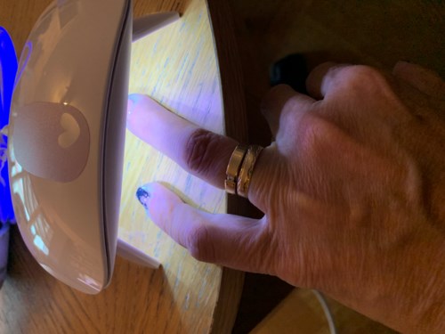 Placera dina naglar under UV LED-lampan, en hand i taget. Tryck på lampans överdel och ha kvar handen tills lampan släcks efter 60 sekunder. Lampan gör att materialet stelnar, vilket både ökar hållbarheten på manikyren och gör att naglarna får en vacker lyster. Tänk på att alla naglar måste in under lampan.