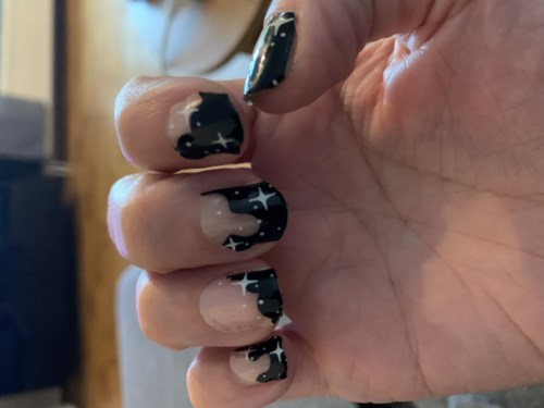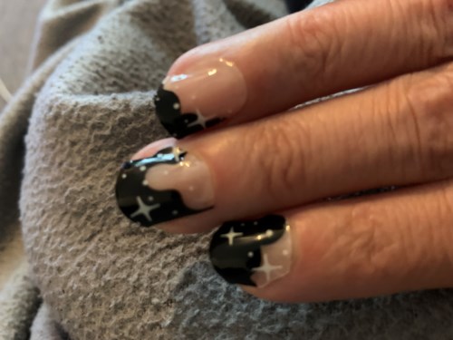 Hela himlavalvet på dina naglar - gör en variant av fransk manikyr med vita oregelbundna tippar och svarta stjärnor med Winter Sky Night WhiteLayers. Semi-transparenta nudefärgade Layers med mönster i svart och vitt.