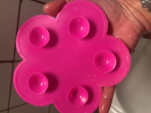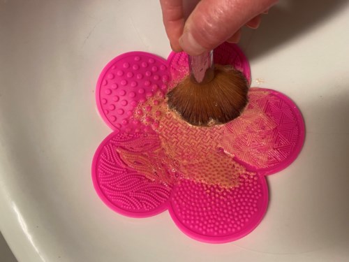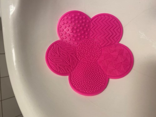 Silikonmatta för rengöring av sminkborstar i form av en blomma. Sugproppar på undersidan håller den på plats för smidig användning.