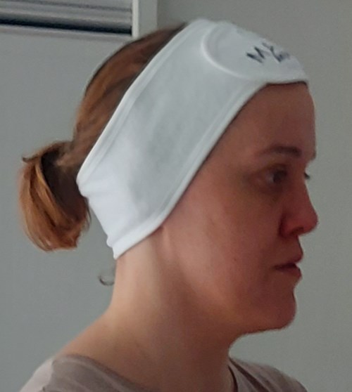 Hårbandet är reglerbart genom ett tunt kardborreband.