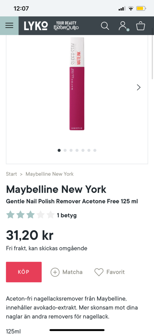 Aceton-fri nagellacksremover från Maybelline, innehåller avokado-extrakt. Mer skonsam mot dina naglar än andra removers för nagellack.